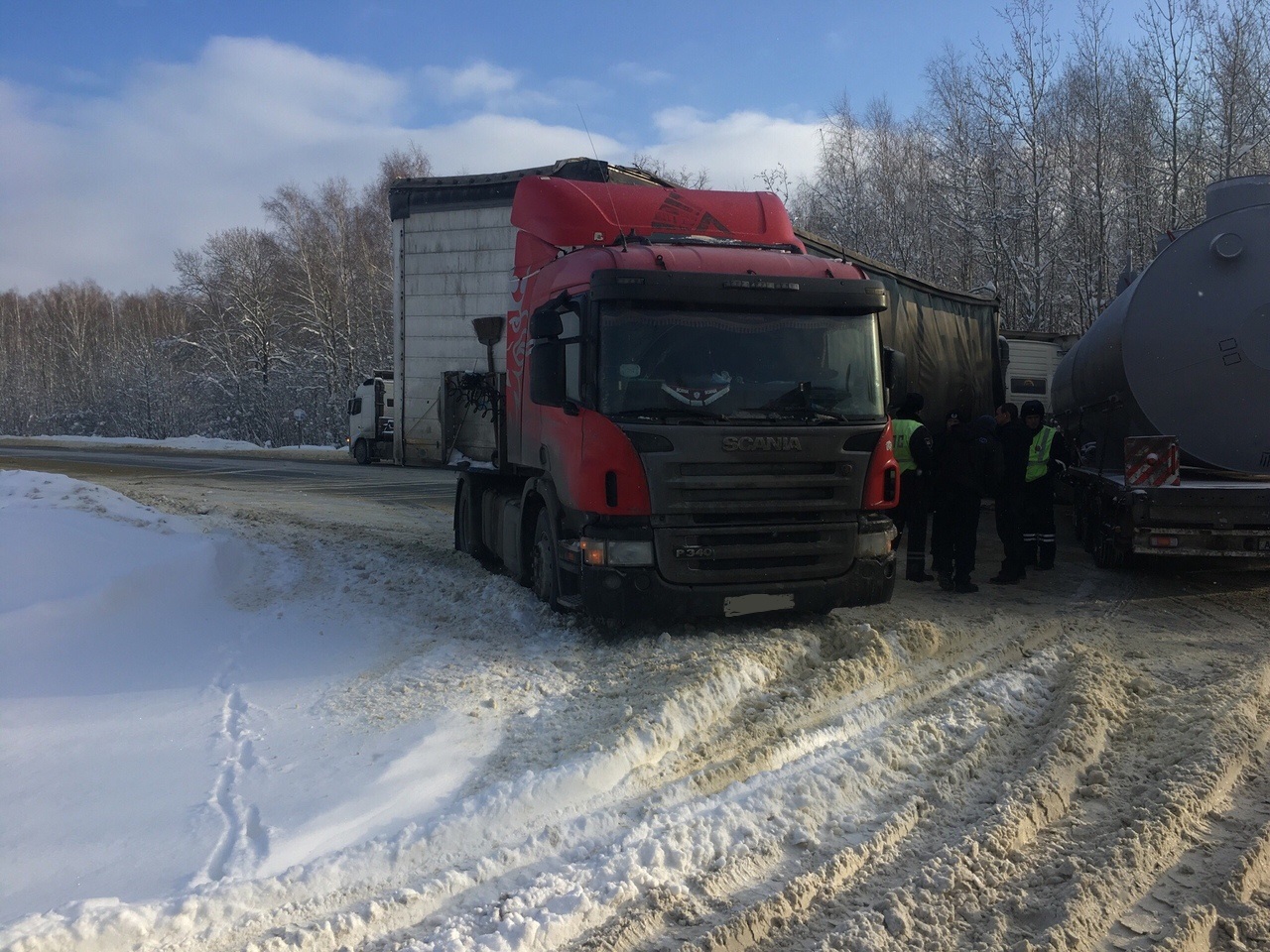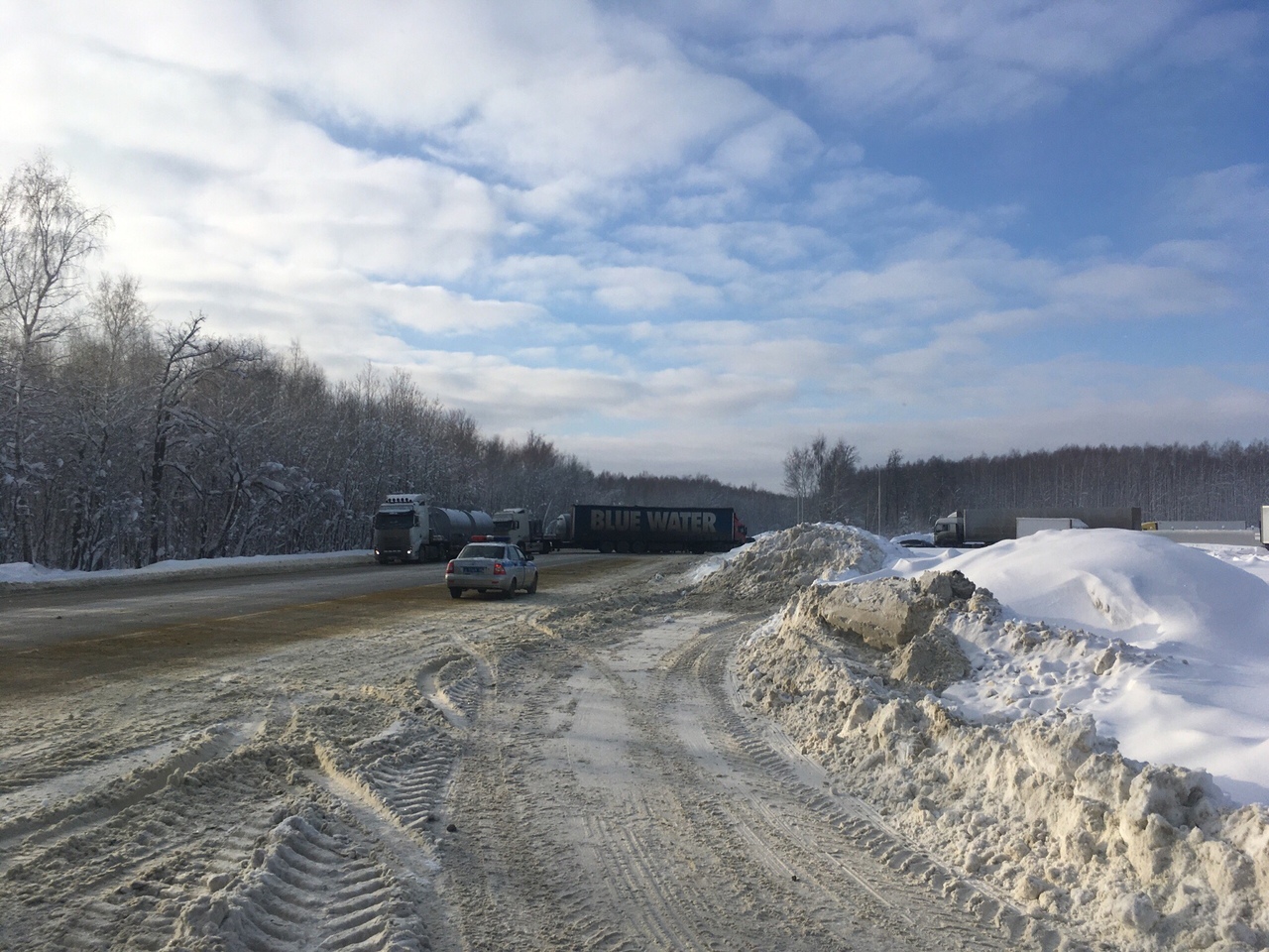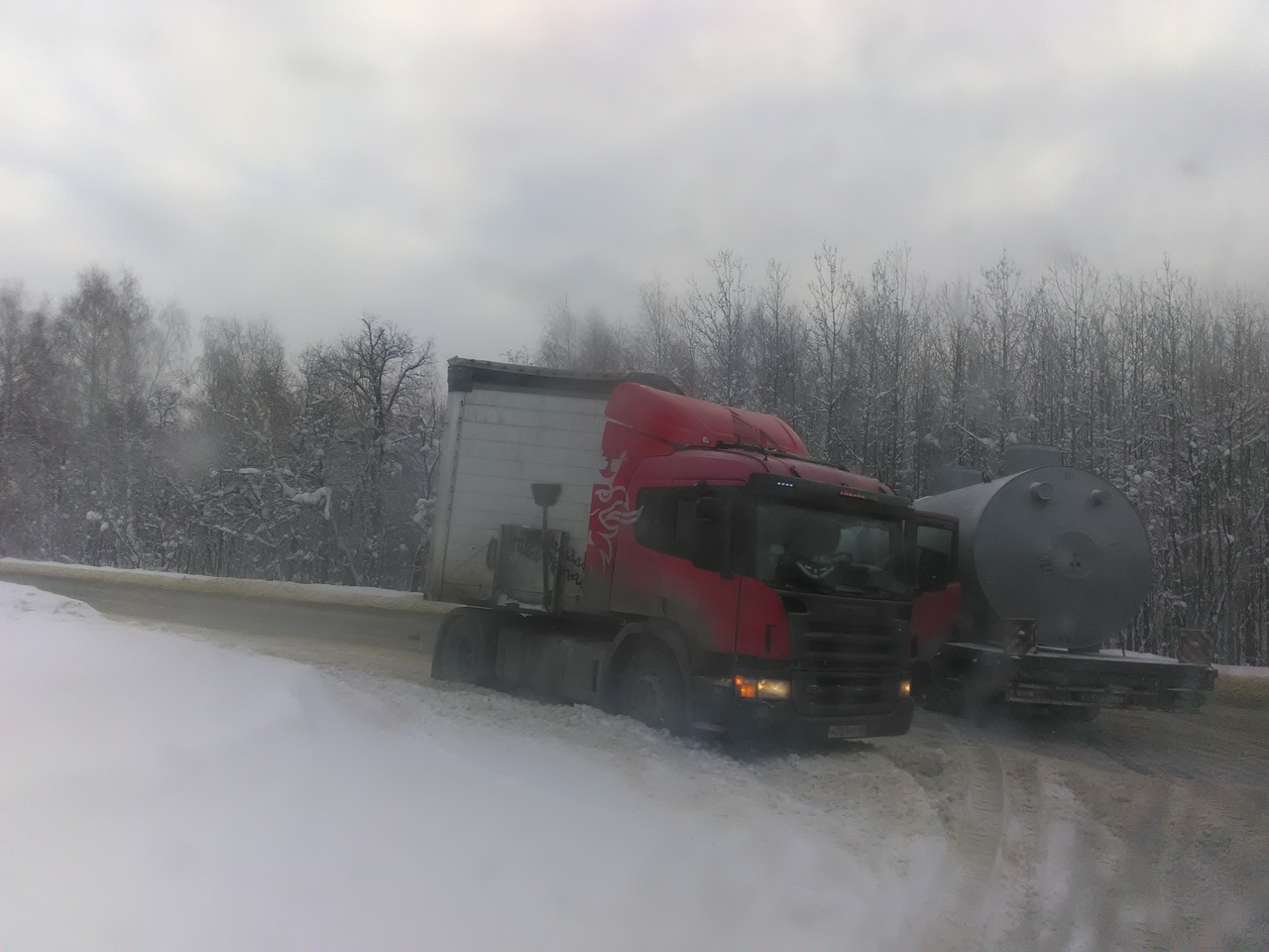 Пользователь опубликовал фотографии с места происшествия в группе «Сова Пенза авто» соцсети «ВКонтакте». Автор записи пояснил, что утром 17 января на трассе занесло две фуры. Большегрузов развернуло, они перекрыли проезжую часть полностью.